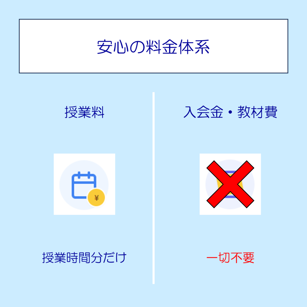 指導料は授業料のみで、当月の指導時間分を翌月末までにお支払いいただきます。入会費・退会費や違約金などは一切かかりません。